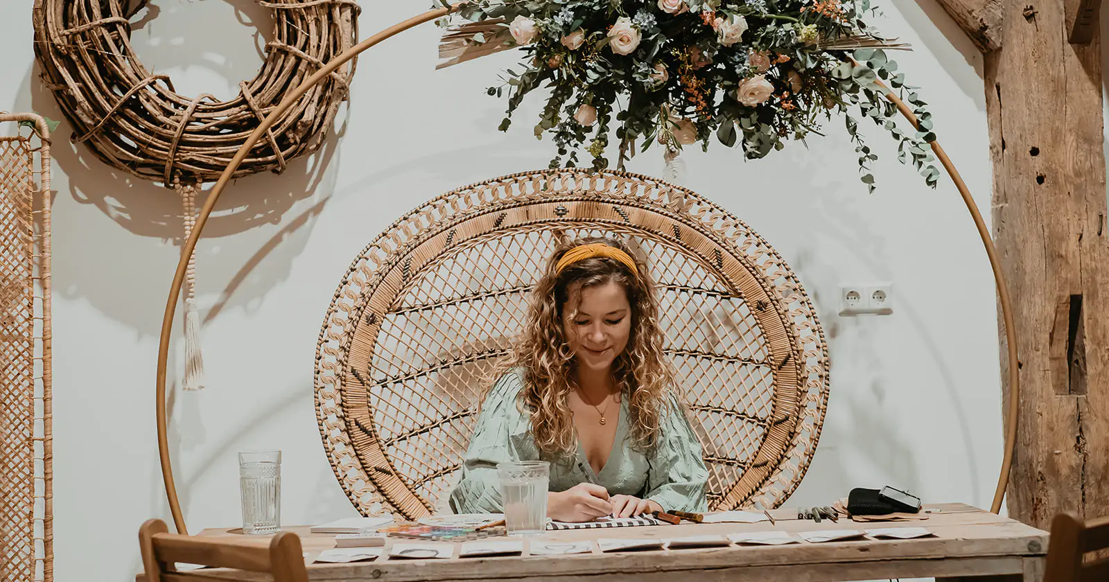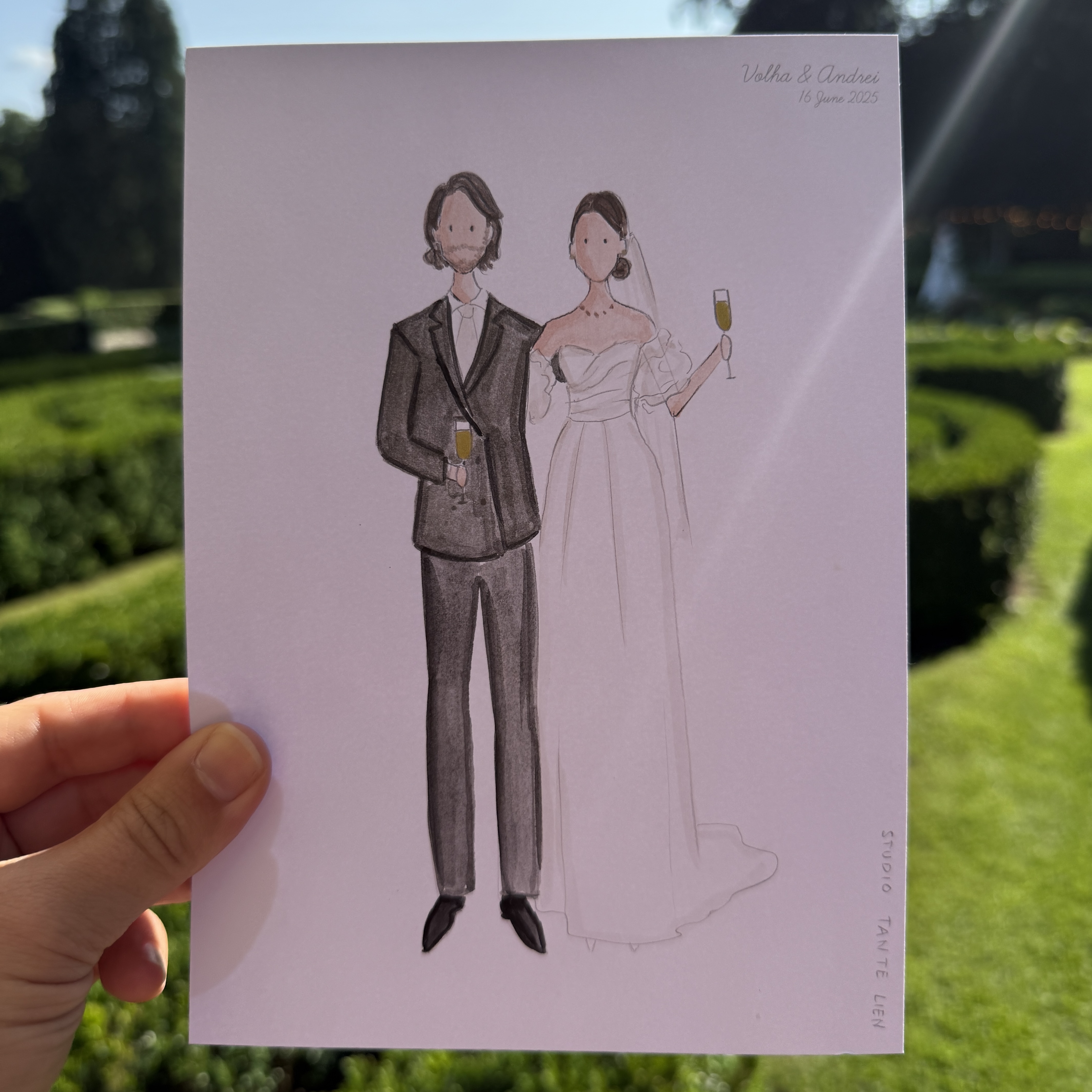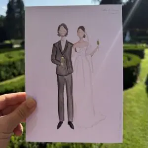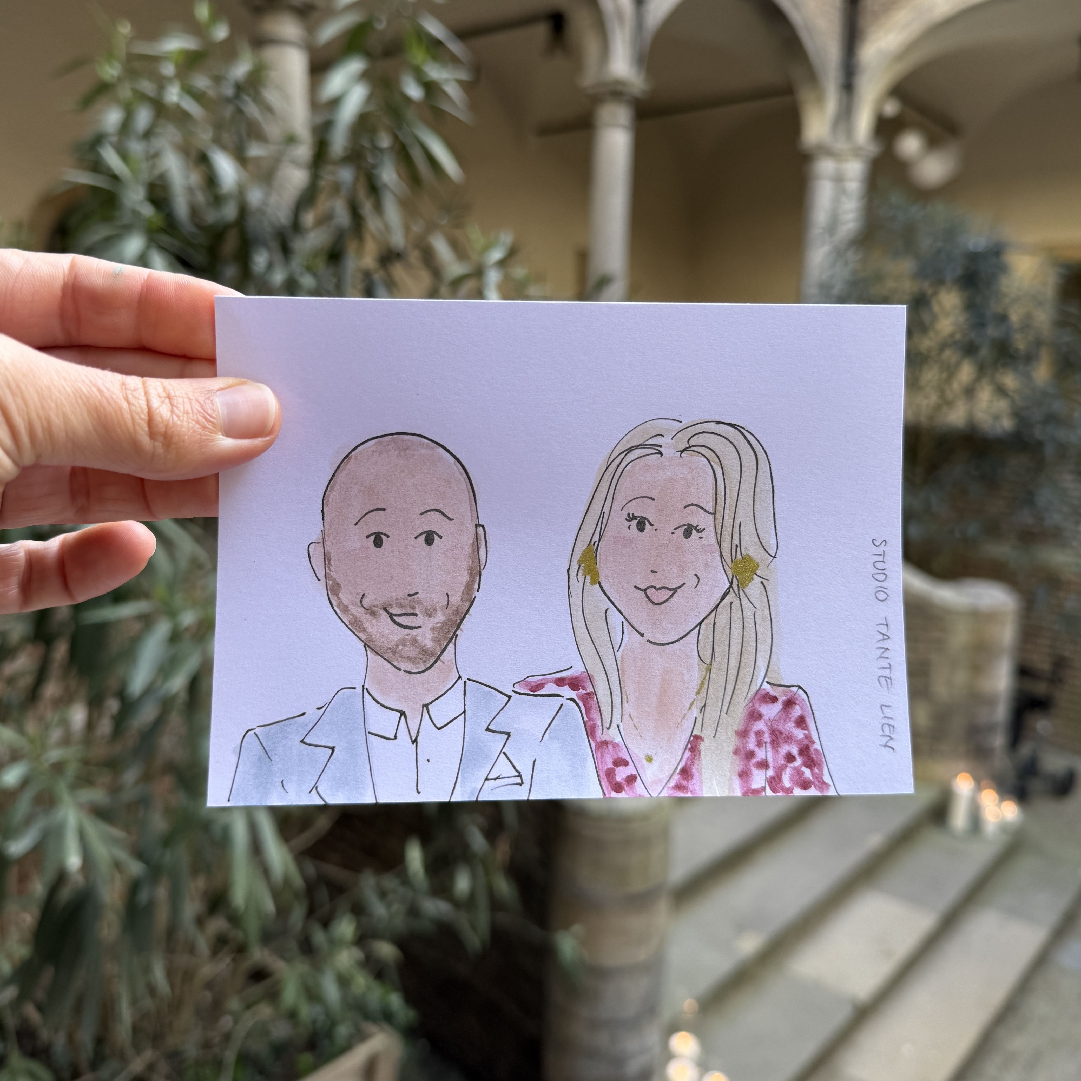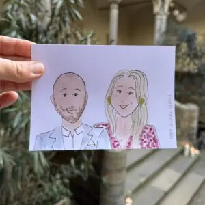 Op de dag zelf teken ik sowieso graag tijdens de borrel. Dit is het perfecte moment hiervoor. Wanneer de tijd van de borrel te kort is, wat vaak zo is, kom ik graag al vóór de ceremonie langs. Ik maak foto’s van de eerste arriverende gasten die ik tijdens de ceremonie vanaf foto’s zal tekenen. Wanneer jullie de borrel in komen gerold hangen de eerste resultaten al klaar aan draad met knijpertjes! Zo kan iedereen zien wat ze zullen krijgen. Dit werkt enorm enthousiasmerend! Tijdens de borrel teken ik door (live of via foto’s) en ik kan zelfs ook tijdens het diner doortekenen.